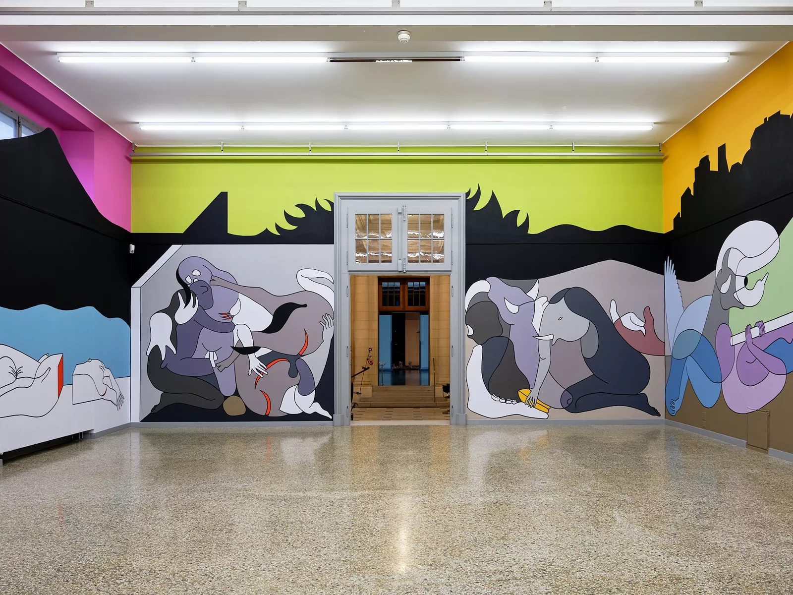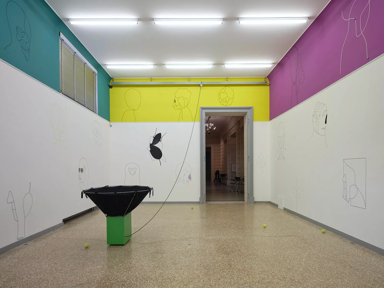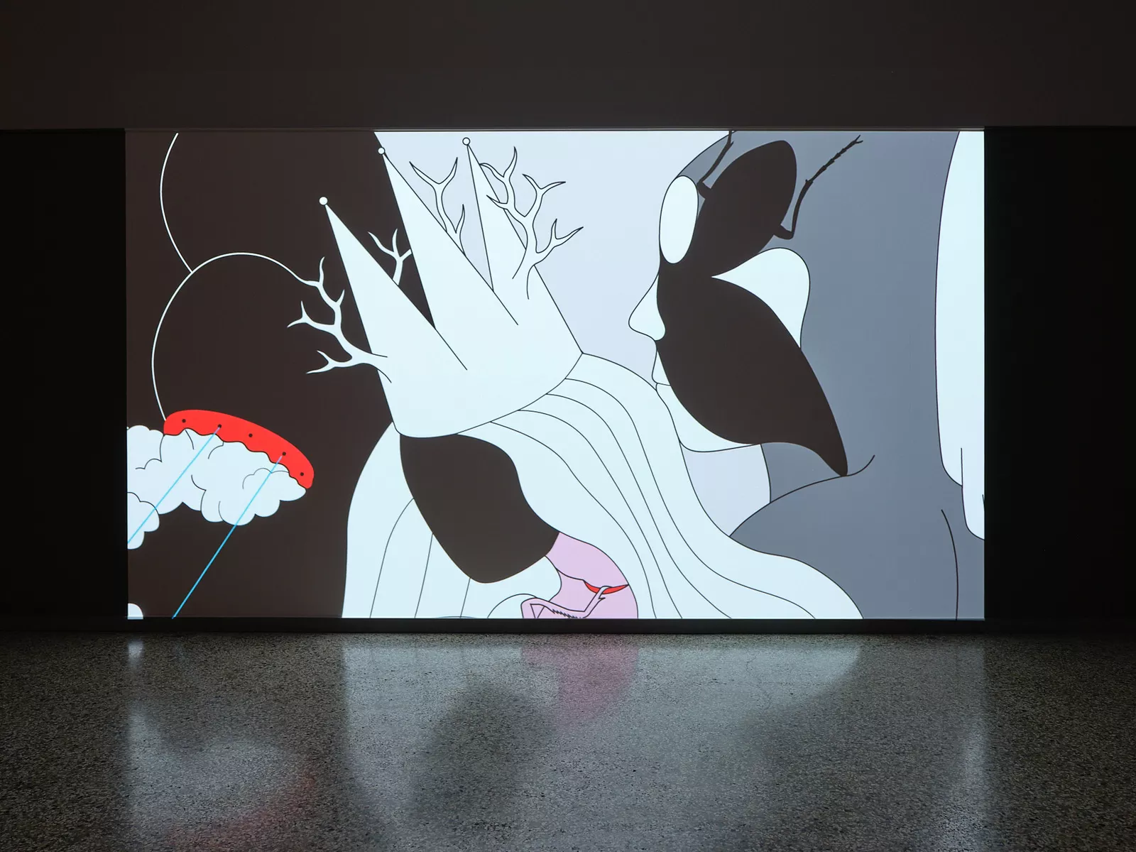 In zwei neuen, animierten Zeichnungsfilmen entfaltet die Linie ihr unerschöpfliches Potential: sie mutiert zum Umriss, zur Fläche, zum Volumen, zum Körper – nur, um sich aufs Neue zu transformieren. Die Zeichensprache des Künstlers lebt vom Metamorphen und Surrealen: ein iPhone entspringt einer Brotscheibe, der menschliche wird zum tierischen Körper, die zärtliche Umarmung zur schmerzhaften Verwicklung. Die Reduktion aufs Wesentliche verstärkt die Wirkungskraft der Figuren, ihre Stilisierung macht sie zu idealen Stellvertreter*innen für unterschiedlichste Betrachter*innen. In der Bildwelt des Künstlers spiegeln sich Überlegungen zu kunsthistorischen Gattungen wie Landschafts-, Historien- oder Porträtmalerei, bis hin zu sich verändernden kollektiven und individuellen Identitäten.