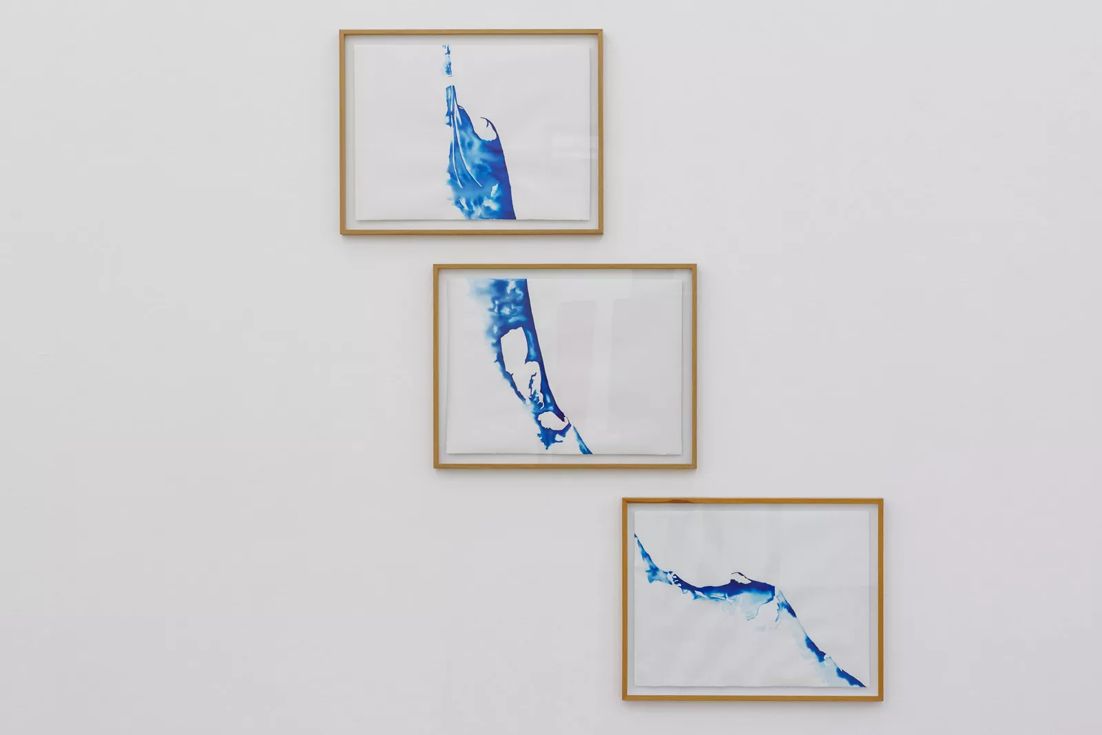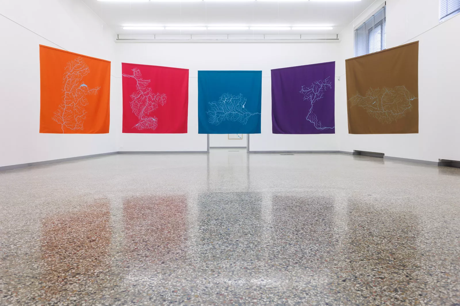 Erstmals im Kunstmuseum Solothurn zu sehen, eröffnen Velardis Bassins Versants die Ausstellung. Auf Stoffbahnen gedruckt, repräsentieren die mehr oder weniger weitverzweigten Wasserläufe von Rhein, Rhone, Po, Donau und Etsch die fünf zentralen Flusseinzugsgebiete, welche die Schweiz mit den benachbarten Ländern und darüber hinaus teilt. In den mitunter fragilen Adern der Bassins Versants spiegeln sich unterschiedliche Interessen und Ansprüche, ökologische wie wirtschaftliche Bedeutungsebenen über nationale Grenzen hinweg. Die Aktivierung der Installation durch Expert*innen – im Rahmen einer Begleitveranstaltung – ist Teil der kollaborativen Arbeit der Künstlerin.