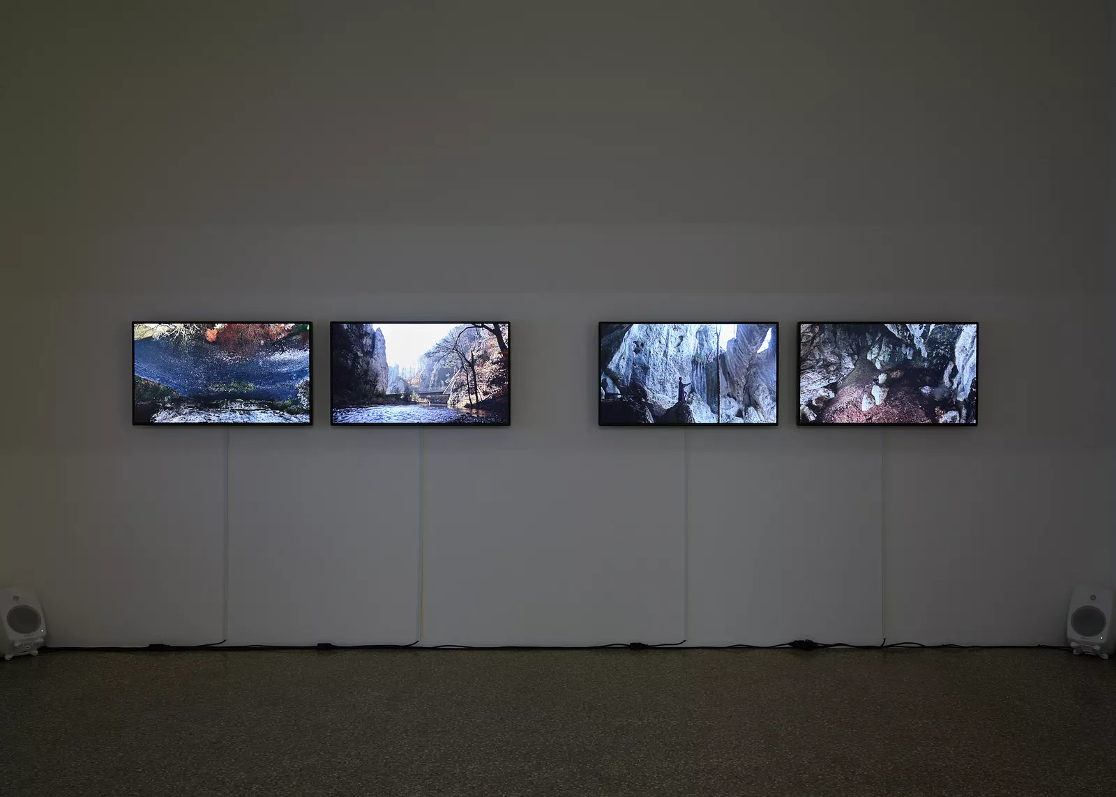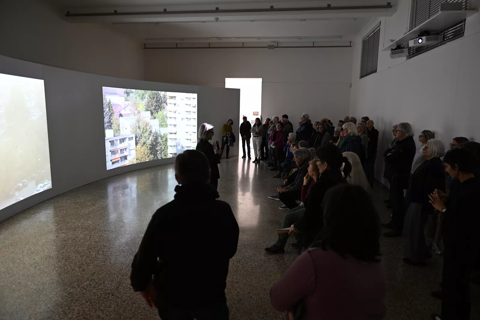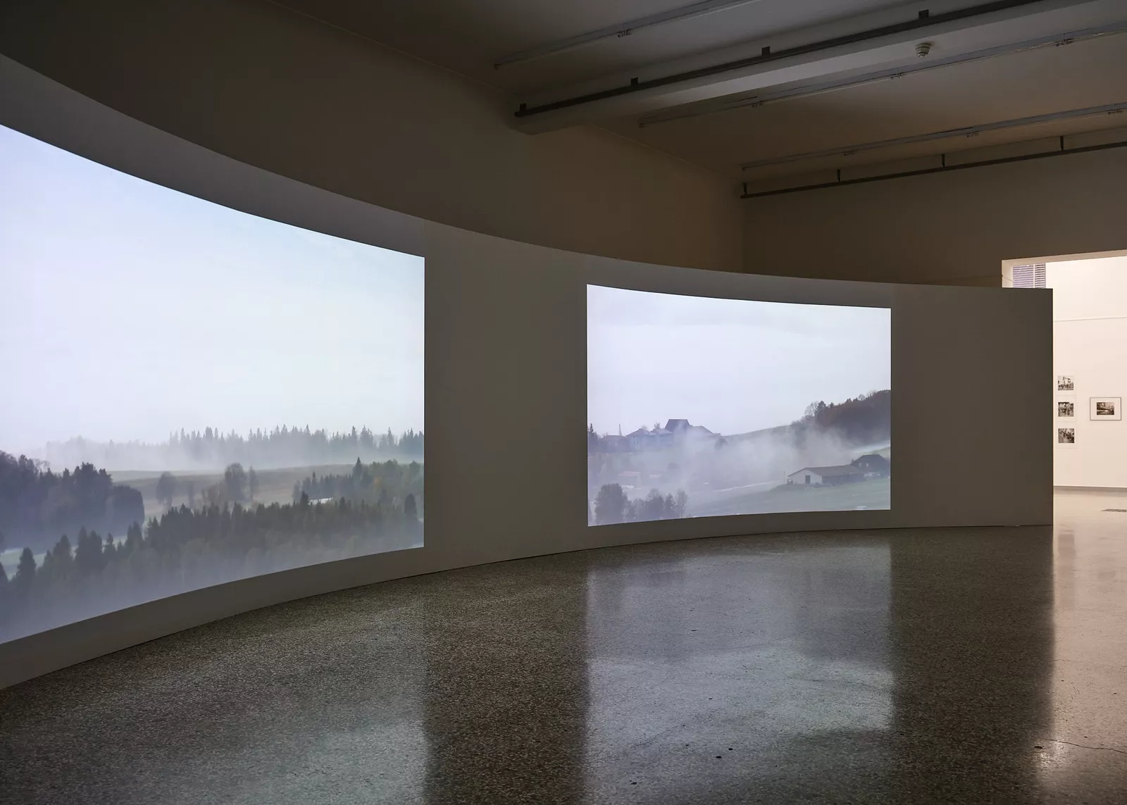 Mit der grundsätzlichen Frage, wie wir die Welt um uns herum wahrnehmen, beschäftigt sich Marie José Burki in ihrer 2-Kanal Videoinstallation Grosse kleine Welt (II) von 2013, die, projiziert auf eine gekurvte Wand, an Panoramen aus dem 19. Jahrhundert erinnert. Es ist eine bildmächtige Hommage an ihre Geburtsstadt Biel und eine Referenz an den Schriftsteller Robert Walser, der selbst als feinsinniger Spaziergänger die Jura-Landschaft durchstreifte und sie in seinen Schriften zum Katalysator für das Nachdenken über die eigene Existenz werden lässt.