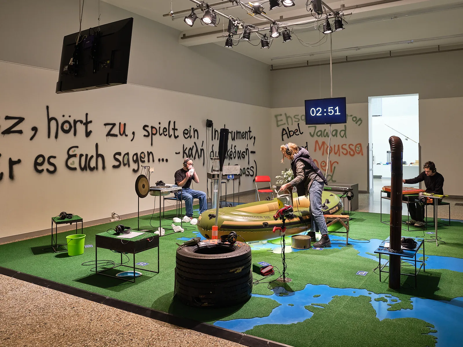 Seit über 20 Jahren entwickeln Rimini Protokoll bahnbrechende Projekte an der Schnittstelle von Theater, Kunst, Gesellschaft und Forschung. Gemeinsam haben Helgard Haug (*1969), Stefan Kaegi (*1972) und Daniel Wetzel (*1969) unter dem Label Rimini Protokoll bisher über 130 Projekte konzipiert, die in vielfältigen Adaptionen um die Welt reisen. Im Kunstmuseum Solothurn zeigen Rimini Protokoll eine Auswahl ihres Schaffens, das keine*n aussen vor lässt: Hier geht es um globale Netzwerke von Waffenhandel und Lebensmittelindustrie, um Klimawandel und Migration, und um die Frage, was passiert, wenn die Statistik der Stadt Solothurn 100 Gesichter bekommt.