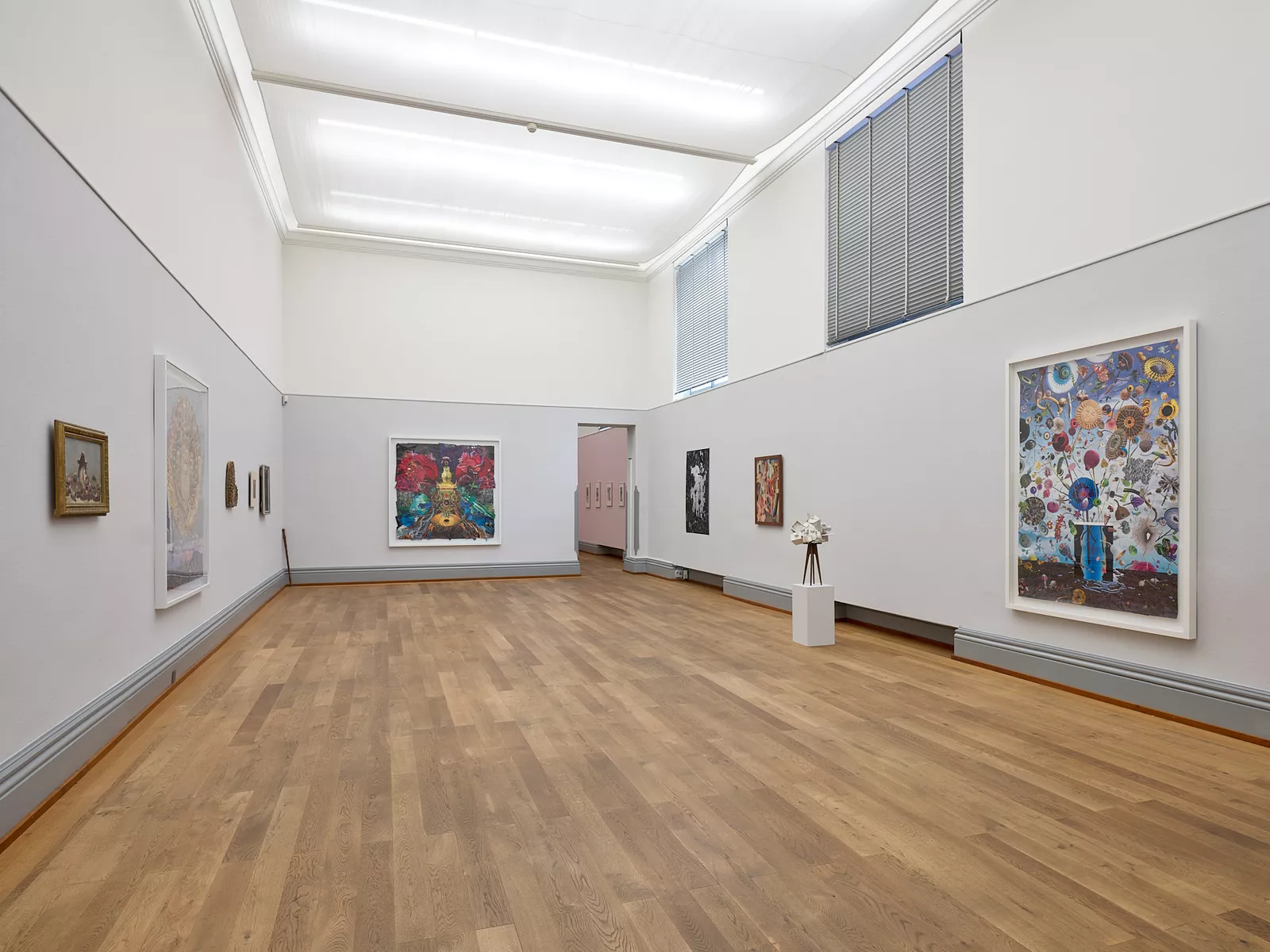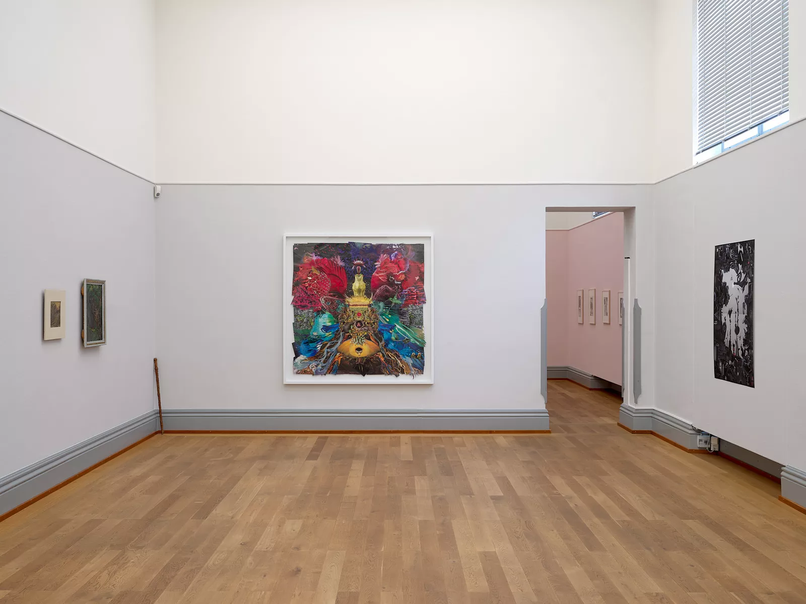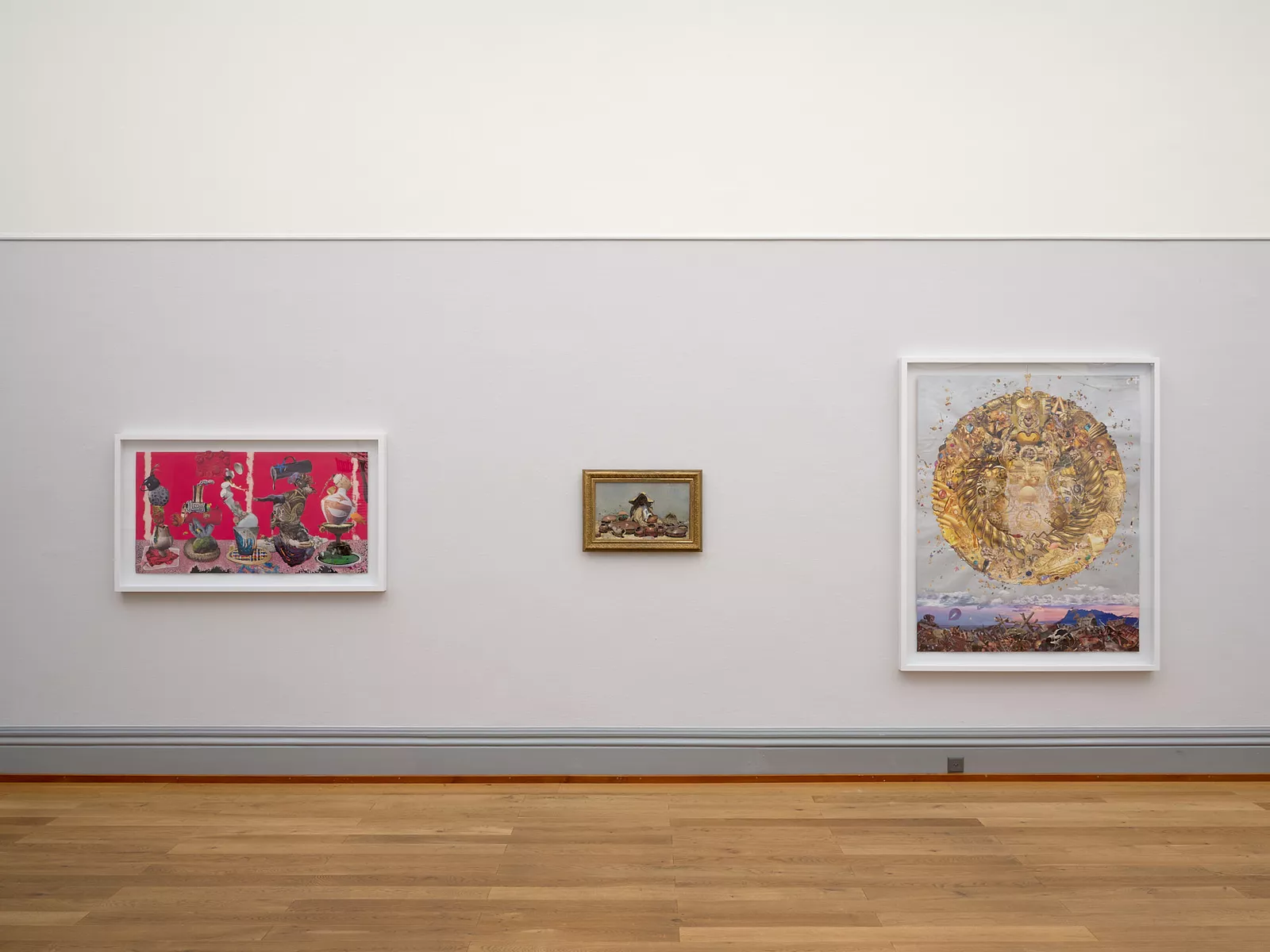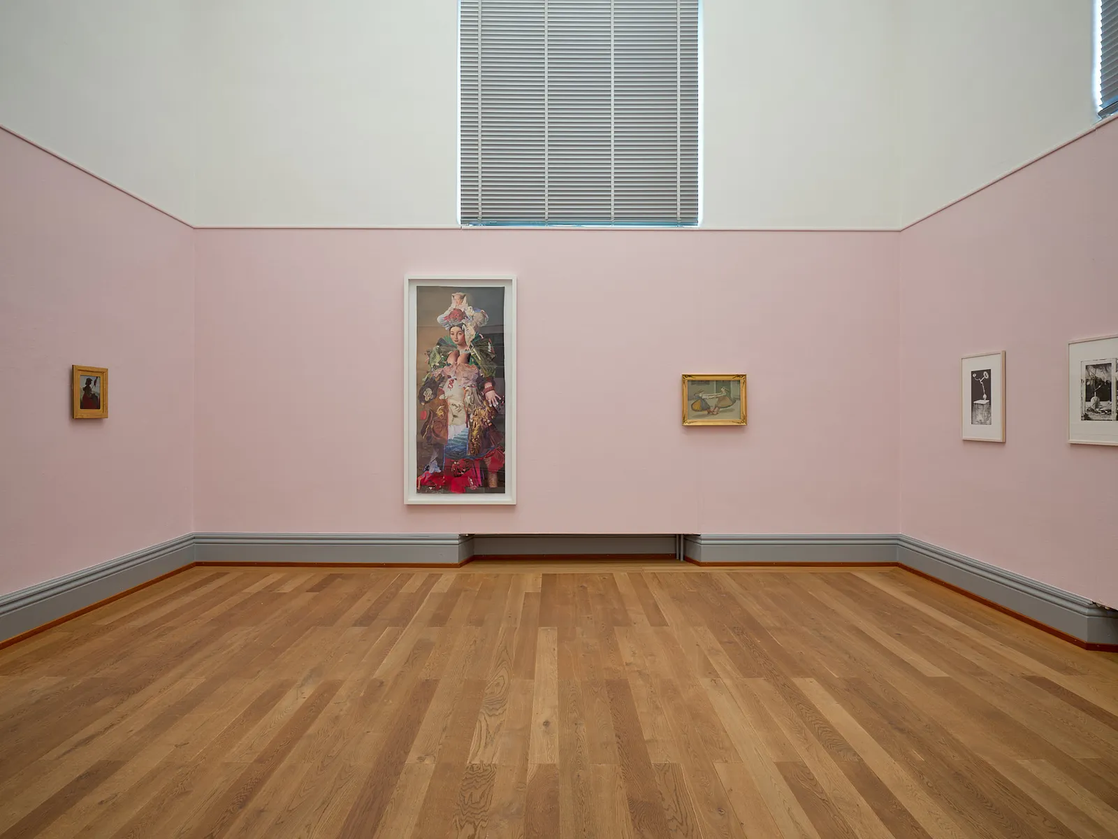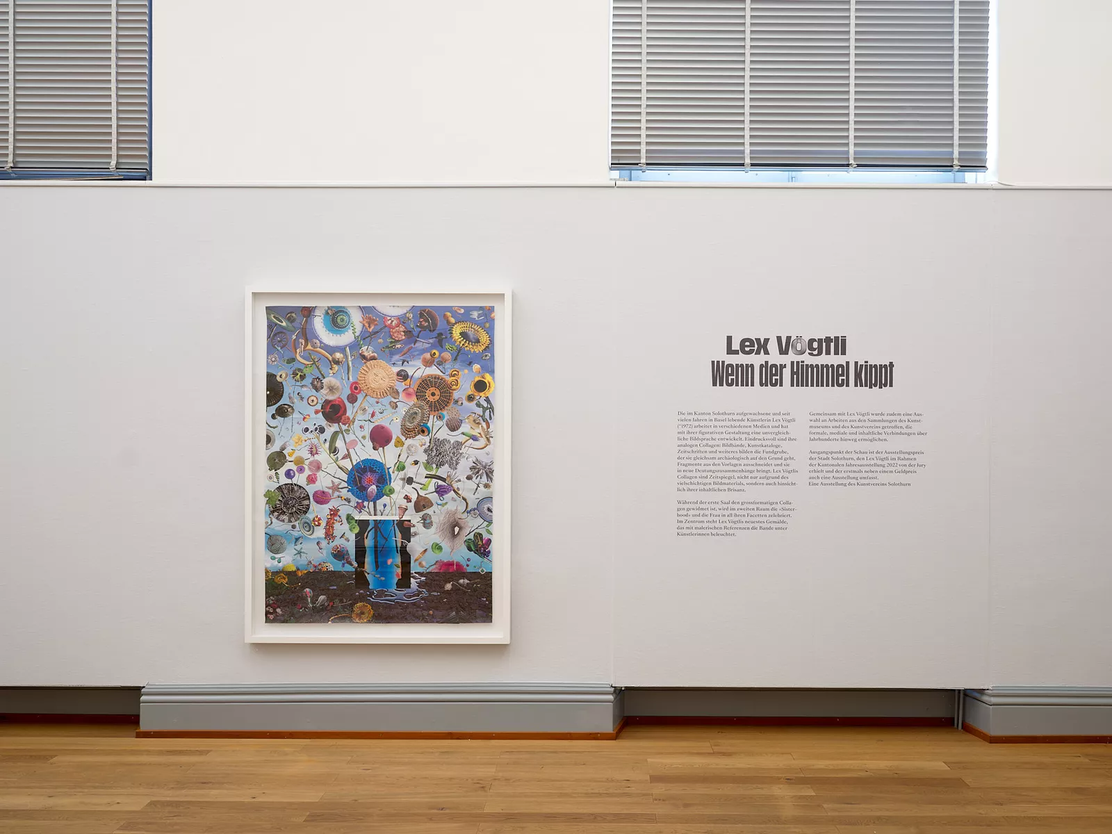 Der wandernde Blick über unterschiedlichstes Bildmaterial ist nicht nur in den Collagen möglich, das Prinzip des Zusammenführens prägt auch die Ausstellung: So haben wir gemeinsam mit Lex Vögtli eine Auswahl von Werken aus den Sammlungen des Kunstvereins und des Kunstmuseums Solothurn getroffen, die stark vom Blick der Künstlerin geprägt ist. Die Sammlungswerke nehmen inhaltlich, motivisch oder formal Bezug auf die Arbeiten von Lex Vögtli und öffnen über Jahrhunderte hinweg weitere assoziative Denk- und Sehräume. Das Thema des Gefässes, eine urmenschliche Form, verbindet Lex Vögtlis Collage «Balance» mit dem Gemälde des Solothurner Malers Frank Buchser, der 1880 zum dritten Mal und für acht Monate in Marokko weilte. Aber auch mit «Wenn der Himmel kippt» können die auf Buchsers Bild ausgebreiteten Töpfe gelesen werden, wenn auch unter anderen Vorzeichen. Ausgehend von «Kosmos» gilt der nächste Themenkreis der Natur mit einem frühen Bild von Hans Erni, dessen Bild die Synthese von Mensch und Natur zeigt. Die Struktur der Rippen in Zoltan Kemenys Relief ist nicht nur gleichsam ein Echo auf den Goldring in der Collage «Wenn der Himmel kippt», die Form erinnert an ein Fragment eines grösseren Ganzen, eines Fundstücks aus der Natur. Der Detailreichtum, die Ranken und Üppigkeit der Natur sind sowohl in Urs Eggenschwylers Panther wie im wundersamen Spazierstock von Martin Disteli zu entdecken. Die leuchtenden Augen des Panthers finden in den im mittig gesetzten Auge des Rotaugenlaubfroschs auf der Collage eine Entsprechung – die Natur blickt uns eindringlich an. Auf der anderen Längsseite löst die urbane Landschaft, die Architektur um Lex Vögtlis Druck «Am Stadtrand» die Natur ab. Konstruktion und Dekonstruktion werden bei Otto Tschumi und Barbara Wiggli in unterschiedlichen Formen und Medien behandelt.