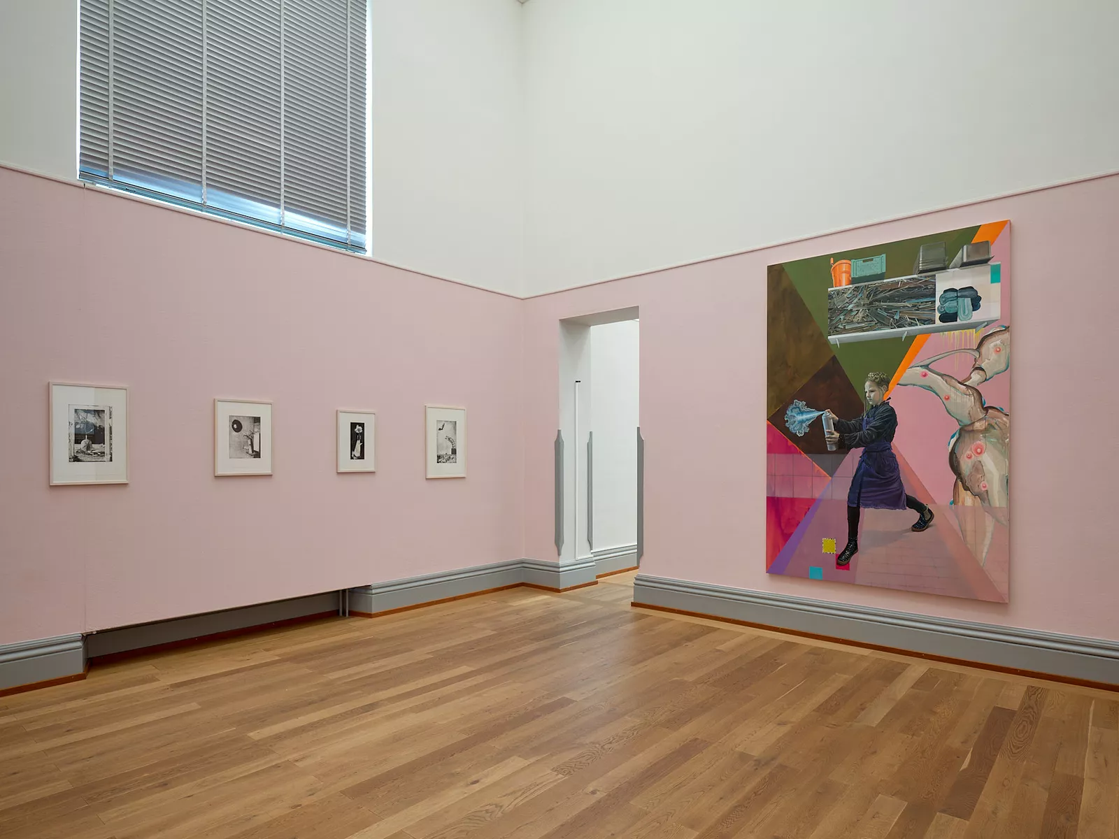 Ist der erste Saal den Collagen von Lex Vögtli gewidmet und umfasst ein breites Themenspektrum, so steht im zweiten Raum die «Sisterhood» und die Frau in all ihren Facetten im Zentrum. Nach einem längeren Unterbruch hat Lex Vögtli die Malerei wieder aufgenommen und feiert im persönlich gefärbten Bild «Handeln» (2023) die Bande unter Künstlerinnen: Malerisch nimmt sie mit Interpretationen, Zitaten und Referenzen Bezug auf drei Solothurner Malerinnen, die sie besonders schätzt: Dimitra Charamandas, Gergana Mantscheva und Maja Rieder. In der Mitte steht Alma, die Tochter der Künstlerin, in der Küche von Lex Vögtlis Partner Gilbert Engelhard «in action». Ihr vis-à-vis hängt die «Frau», für deren Kopffragment Lex Vögtli sich bei Dominique Ingres’ Porträt von Mademoiselle Rivière bedient hat. In der eindrucksvollen Collage geht es drunter und drüber, auffällig ist der aus Schnipseln zusammengesetzte Faltenwurf des Kleides, der auch in den weiteren ausgewählten Bildern in diesem Raum zum Thema wird. Von Karl Itschners «Ringelreihen zu zweit» ist es ein kleiner Sprung zu Lex Vögtlis «Discoqueen», die den Auftakt zu den Polymerdrucken macht, einer für Lex Vögtli mit ihren Collagen verwandten Form. Auf den ersten Blick erinnern die Tiefdrucke an Blumenstillleben. Auf den zweiten Blick tritt das Rebellische, Hintergründige oder Surreale hervor.