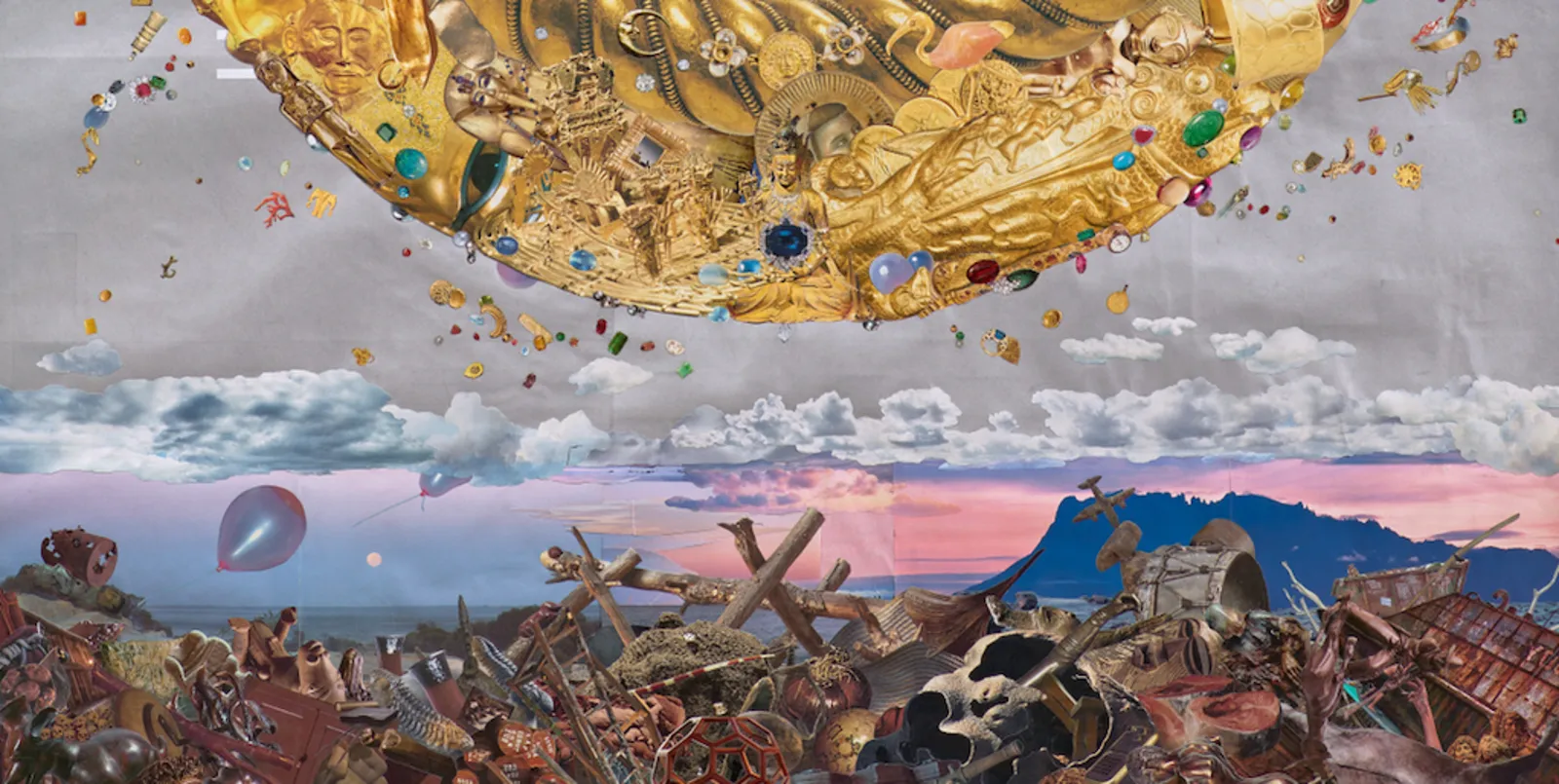 Von Weitem ziehen die grossen Collagen, die mehrheitlich für diese Ausstellung entstanden sind, mit ihrer Farbigkeit, der Kleinteiligkeit und den Motiven den Blick an. Aus nächster Nähe wird es komplizierter, denn nichts ist so, wie erwartet, vielmehr öffnen sich nochmals unzählige Bildinhalte und -ebenen, machen die Schnittstellen die neuen Zusammenhänge deutlich, die wir gedanklich erst verarbeiten und verbinden müssen. Lex Vögtlis Collagen fungieren aufgrund des vielschichtigen Bildmaterials und hinsichtlich ihrer inhaltlichen Brisanz als Zeitspiegel: «Balance» thematisiert mit den Gefässen, den Töpfen und Krügen die prekäre Stabilität des menschlichen Seins; und während die Kulturgeschichte auch in «Wenn der Himmel kippt» unter unterschiedlichen Vorzeichen dominiert, zeigt sich in «Kosmos» die Natur in ihrer Vitalität und Verletzlichkeit. Lex Vögtli nimmt mit Vor-Bildern aus unterschiedlichsten Jahrhunderten Bezug auf dringliche Themen der Gegenwart, doch sie tut dies nicht mit erhobenem Finger, sondern durchaus mit Humor und einer Prise Ironie.