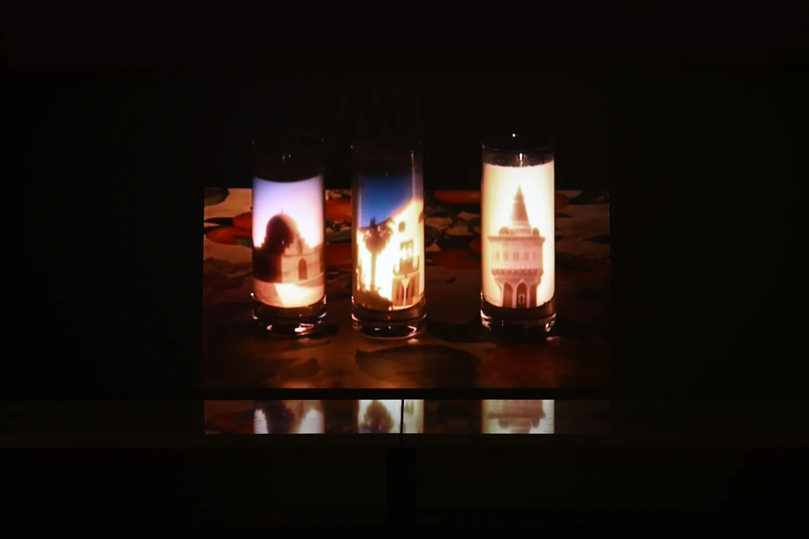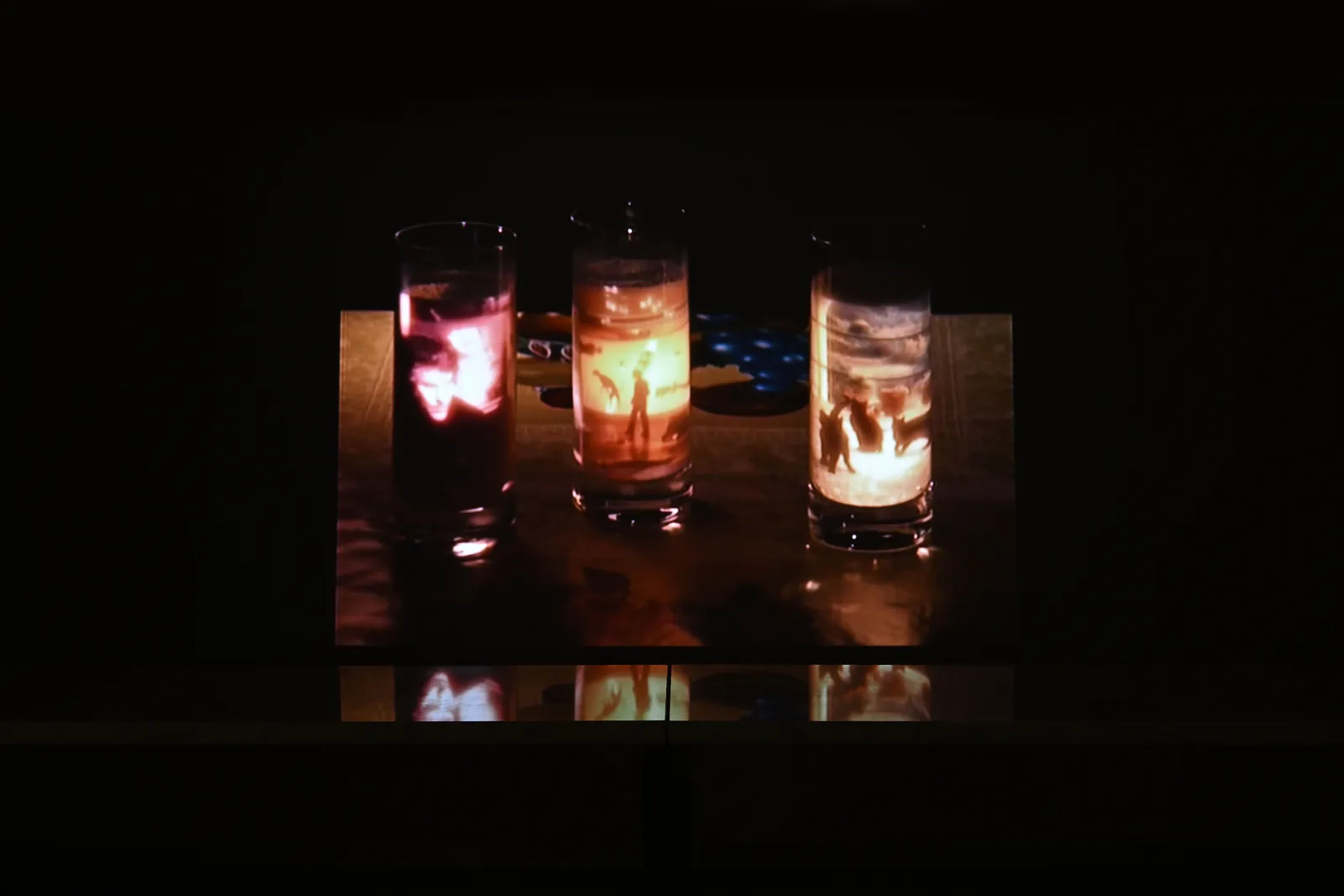 1-Kanal-Videoinstallation, Farbe, Ton Stereo, 22'56", PAL, 4:3, Edition 2/3, Projektion mit Reflektion auf Marmor-Tischplatten