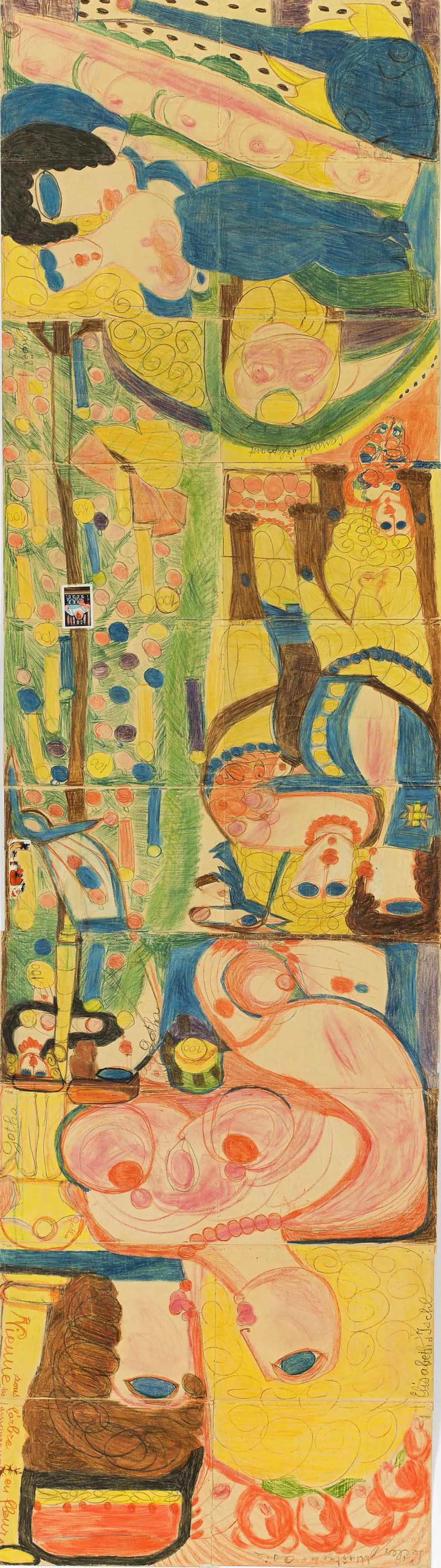 Farbkreiden, Farbstifte, Gouache, Collage auf Papier. Aufgenähte Drucksachen. 10 Blätter zusammengenäht.
