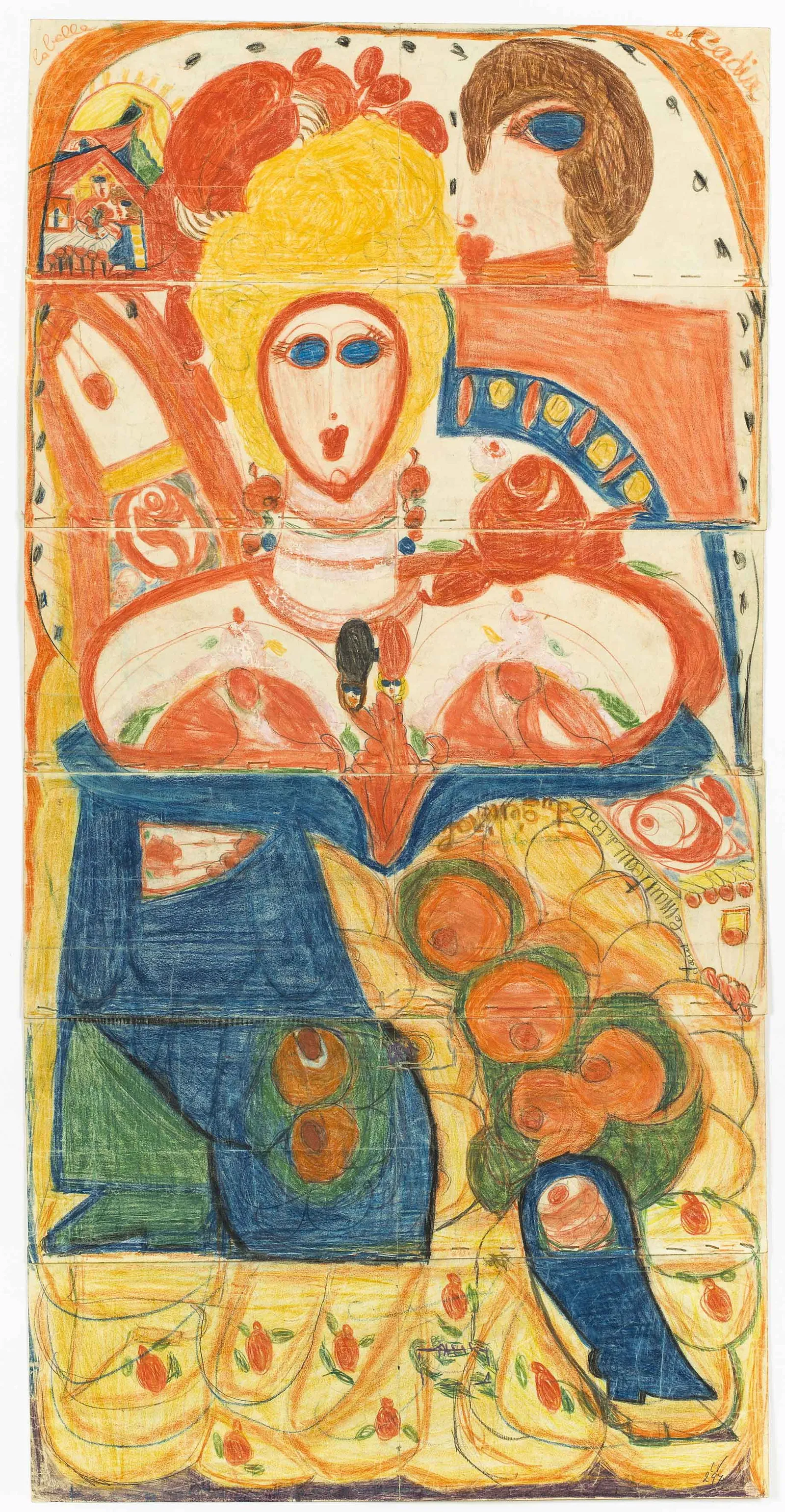 Ölkreide, Farbstift und Gouache auf Papier, aufgenähte Drucksachen. 6 Doppelblätter (aus Zeichenheft) zusammengenäht.