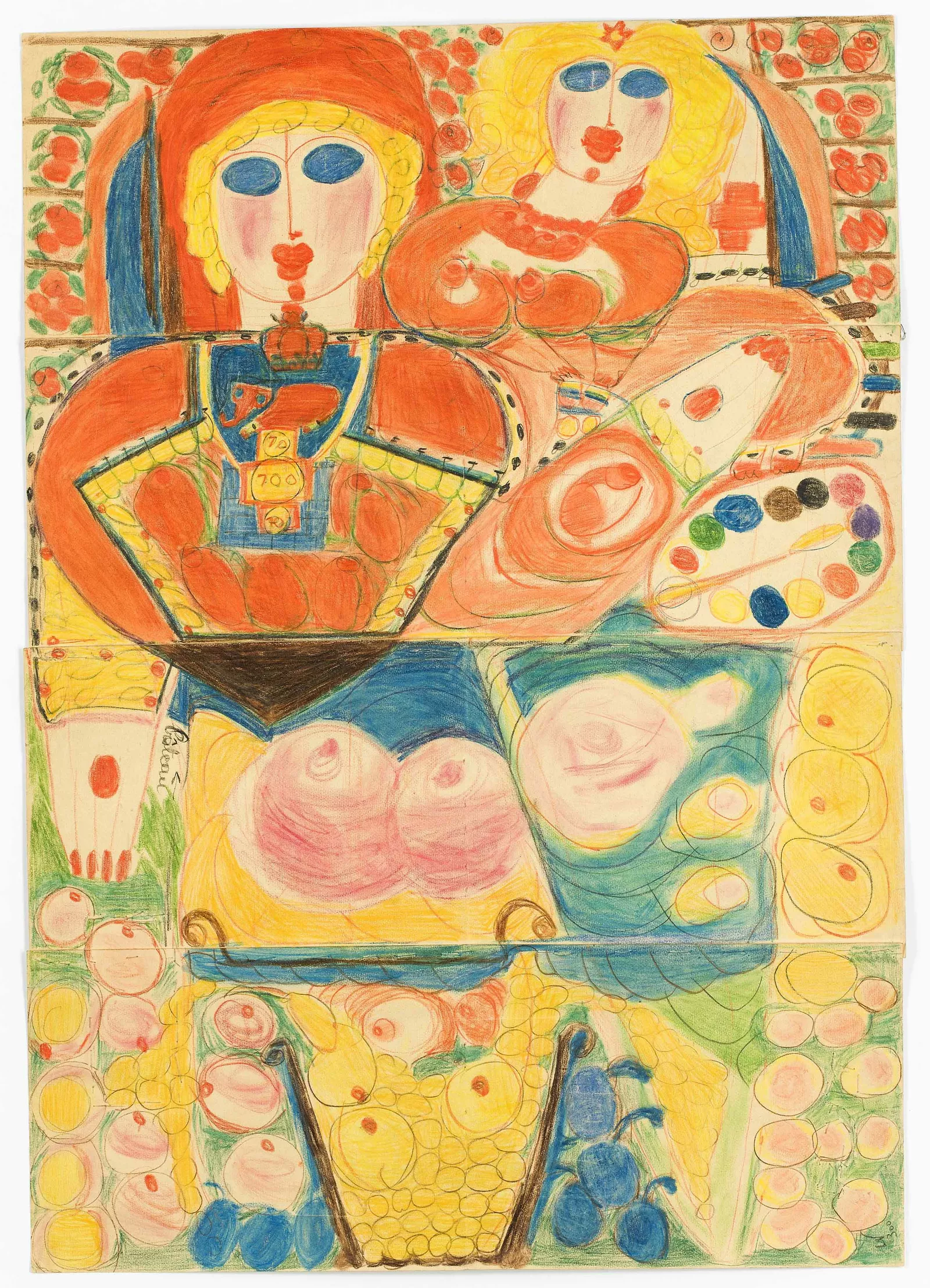 Farbkreiden, Farbstifte auf Papier, aufgenähte Drucksachen (rücks.). 4 Doppelblätter (aus Zeichenheft ), zusammengenäht