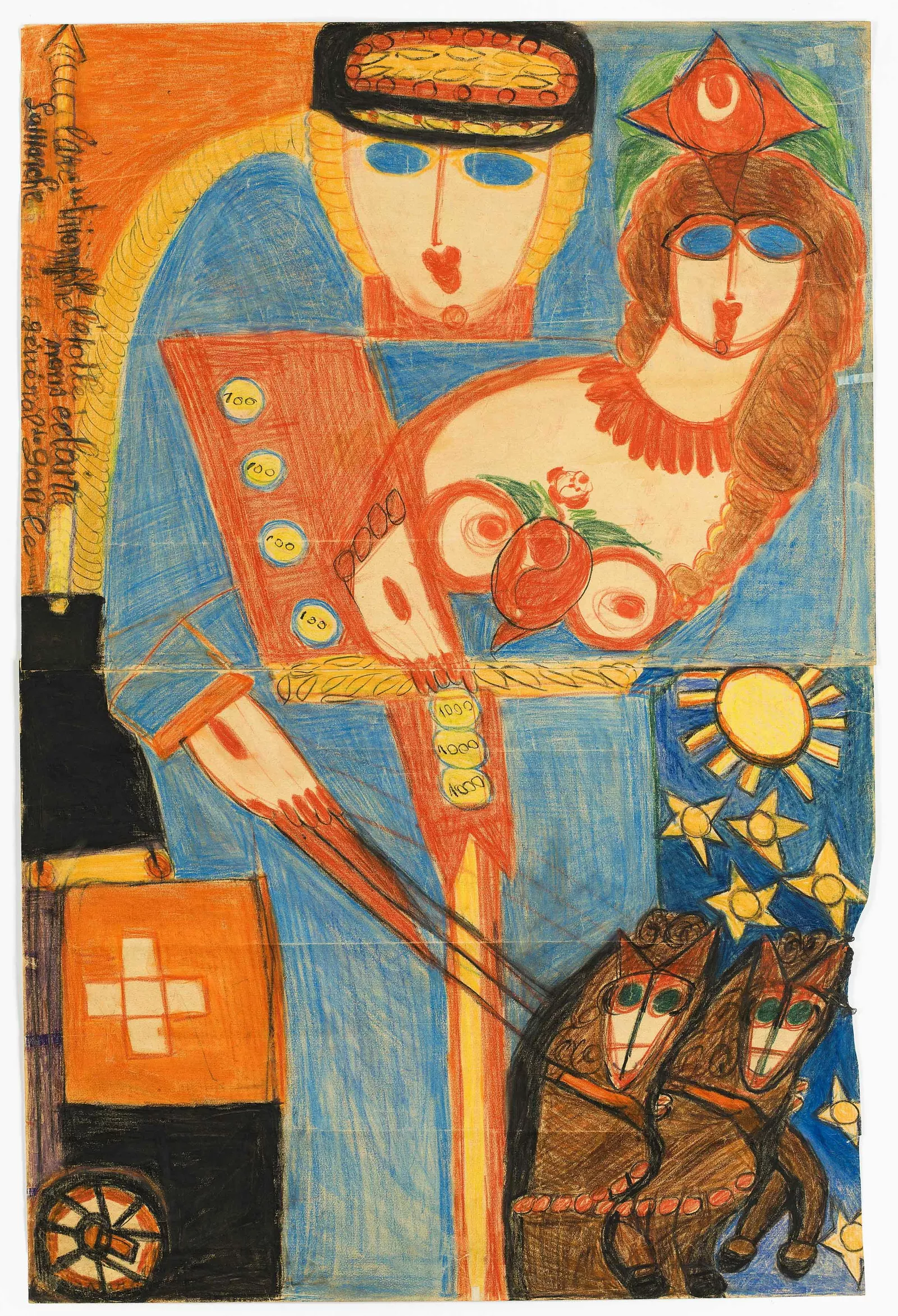 Farbkreiden, Bleistift, Gouache auf Papier. 2 Blätter zusammengenäht