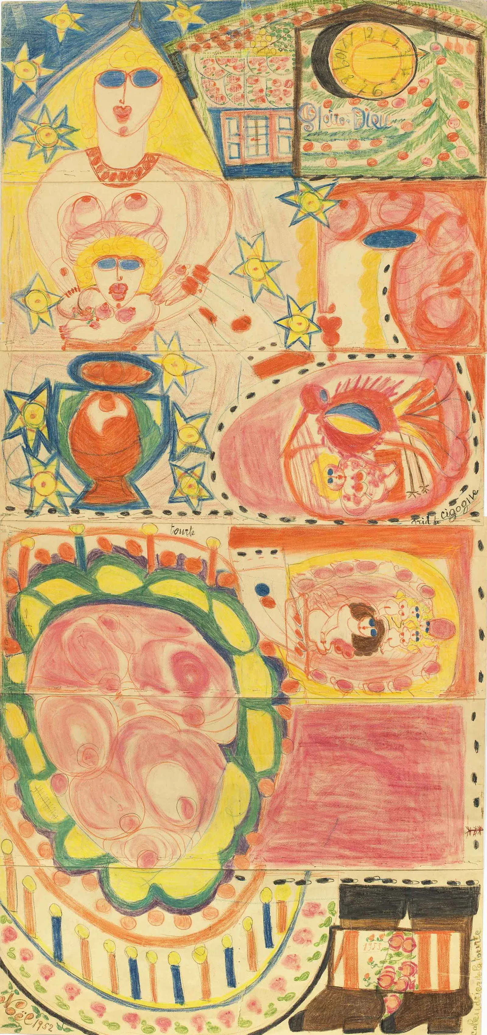 Farbkreiden, Farbstift, Gouache auf Papier. 6 Doppelblätter (aus Zeichenheft) zusammengenäht