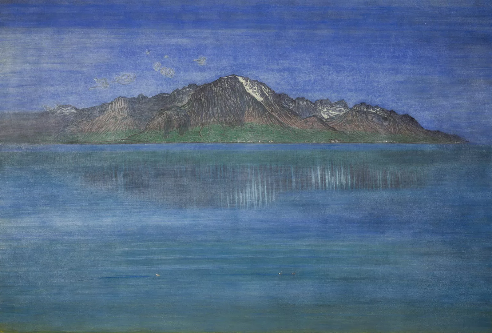Um 1900 zog Alexandre Perrier nach einem Jahrzehnt in Paris zurück nach Genf, wo er von seiner Kunst leben konnte, zumal sich seine Werke schon damals gut verkauften. Er malte ausschliesslich Ansichten vom Genfersee und von der Gegend bei Praz-de-Lys in den Savoyer Alpen, wobei aus der Beschränkung sein Können hervorgeht: in der Vielfalt der Ansichten und in der stimmungsvollen, auf Feinheiten bedachten Malerei. Das Genferseebild mit der betonten parallelen Horizontalen aus Gebirge und Wasserfläche erinnert an die Seelandschaften von Ferdinand Hodler (1853–1918). Die beiden waren befreundet, und wie Hodler ging es Perrier um eine sinnbildliche, beseelte Naturdarstellung im Geiste des damaligen Symbolismus. Perrier bringt dies in der feinen Gebirgszeichnung und im Dunst über dem See auf zarte Weise zum Ausdruck. Von seiner Liebe zum Detail zeugen auch drei winzige Enten auf dem Wasser.