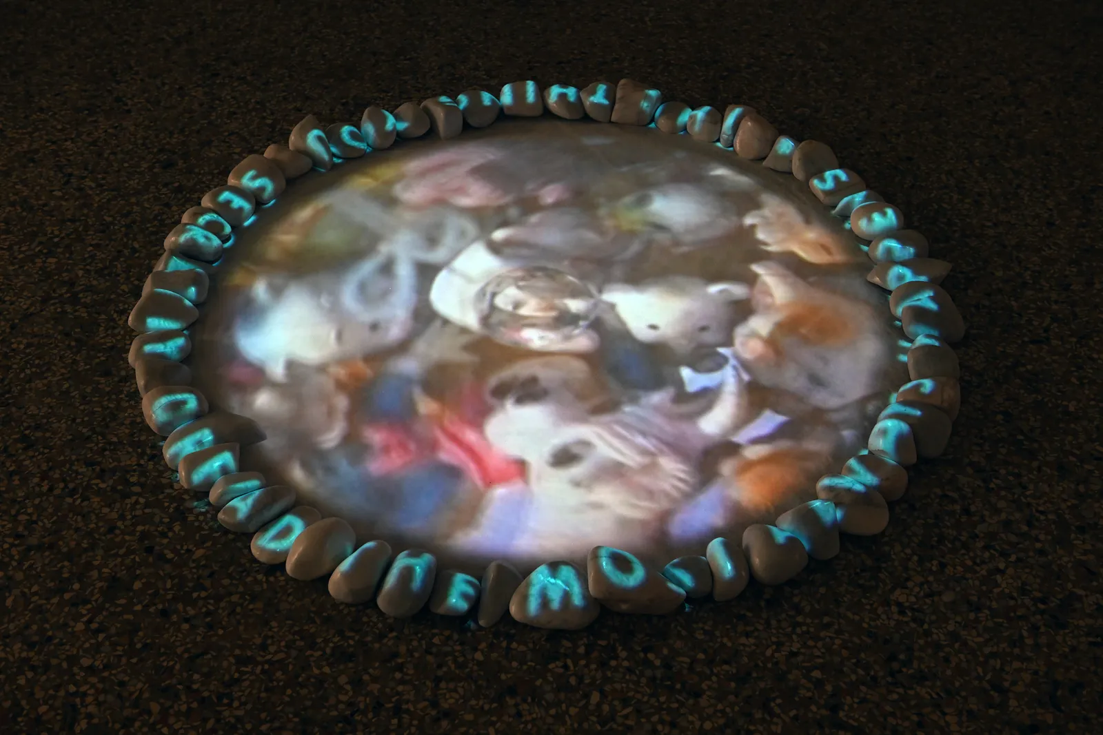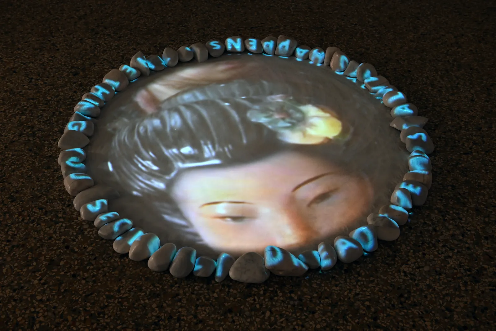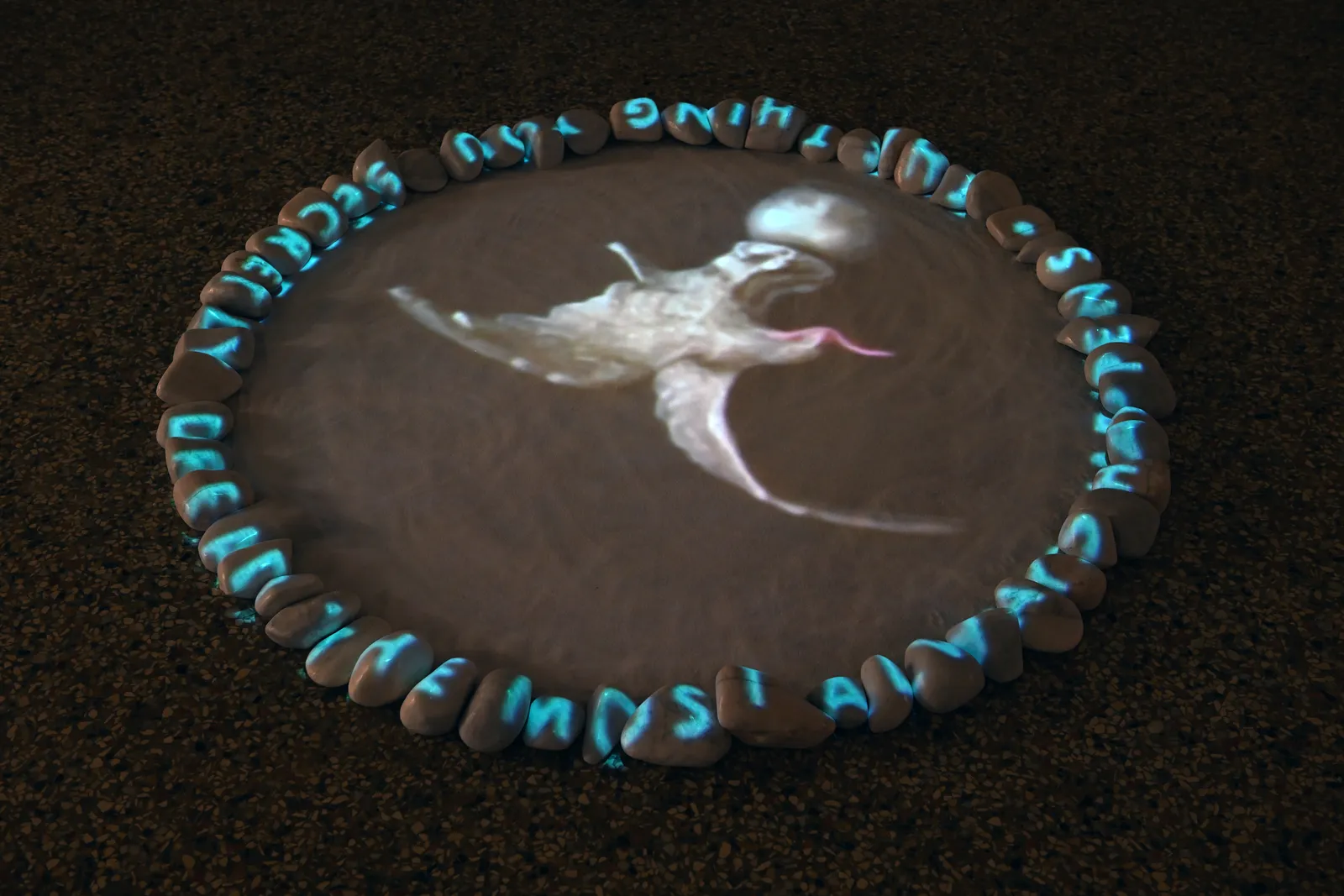 In «Tide» (dt. Gezeiten) wird das Video auf den Boden projiziert. Die Projektionsfläche ist von weissen Steinen gerahmt, auf denen ein Vers in englischer Sprache aus dem Tagebuch des italienischen Dichters Cesare Pavese zu lesen ist: «Was man am meisten fürchtet, tritt immer ein.» Die Aneinanderreihung von Bildern in einer Kristallkugel wird durch die vertikale Projektion in kreisrunder Form verstärkt. Das Interesse an Bewegtbildern und der Möglichkeit, über ihre Projektionen die Komposition und Motive der bilddurchfluteten Gegenwart kritisch zu analysieren, hat Silvie Defraoui seit den 1970er-Jahren entwickelt. Dabei experimentiert sie mit unterschiedlichen Projektionsformen auf Materialien wie Salz sowie der Verunsicherung der Betrachter*innenperspektive durch das Projizieren auf den Boden.